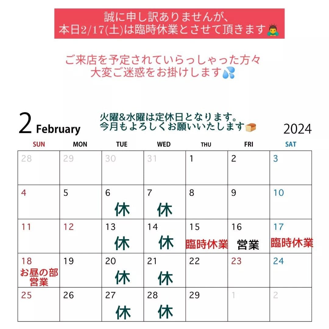 2/17(土)臨時休業です🙏 2024年2月17日 2024/02/17(土)いつもルパンルパンをご利用頂きありがとうございます。急な連絡で誠に申し訳ありませんが、本日2/17(土)は臨時休業とさせて頂きます🙏ご来店を予定されていらっしゃった方々、大変申し訳ありません🙇♂尚、明日2/18(日)はスタッフ不足によりお昼の部(11:00-14:00)のみの営業とさせて頂きます。重ね重ねご迷惑をおかけいたしますが、よろしくお願いいたします🙏 前 2/15(木)は臨時休業です💦 最近 2/26(月)は臨時休業です🙏