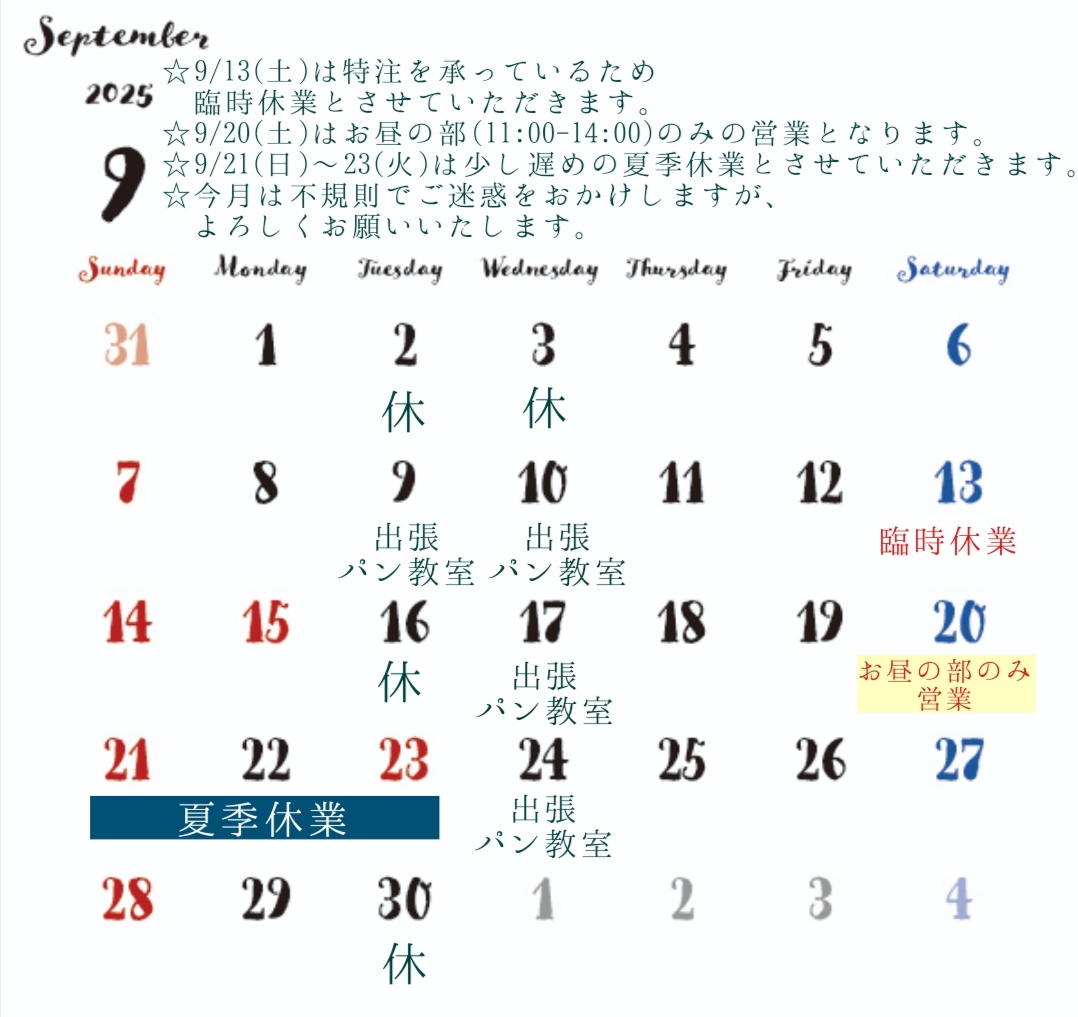 9月営業カレンダー🥐 2025年9月1日 2025/09/01(月)いつもルパンルパンをご利用頂きありがとうございます。いよいよ今日から9月ですね!子ども達の44日間の長い夏休みが終わってホッとしました☺️まだまだ日中は暑いですが、日の沈む時間が早くなり、リーンリーンと鳴く虫の音に秋の訪れを感じています。9月の営業カレンダーです🥐9/13(土)は、特注をたくさん承っている為、臨時休業とさせていただきます。9/20(土)は、お昼の部(11:00-14:00)のみの営業とさせていただきます。夕方の部はお休みとなりますのでご了承ください。9/21(日)〜23(火)は、少し遅めの夏季休業とさせていただきます。今月は不規則な営業となりご迷惑をおかけしますが、よろしくお願いいたします。9月中旬より、栗バターフランス等の秋のパンを色々と販売予定です🌰今月もルパンルパンをどうぞよろしくお願いします😊 前 本日8/29(金)は臨時休業です💦 最近 9/5(金)本日臨時休業です💦